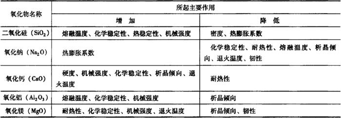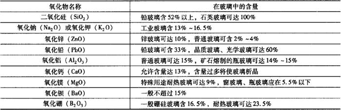 玻璃的组成化学成分比较复杂,主要由一些氧化物组成的,如二氧化硅、氧化钠、氧化钙、氧化铝和氧化镁等,其中二氧化硅占72%左右,氧化钠占15%左右,CaO占9%左右,另外还有少量的氧化铝和氧化镁等。各种玻璃中的主要氧化物含量如表17-1所示,氧化物在玻璃中均起着不同的作用,如表17-2所示。