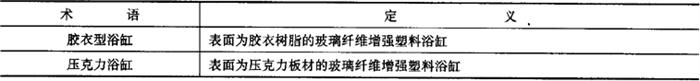 | 释义 | 玻璃纤维增强塑料浴缸 1.术语(表6-57) 表6-57 玻璃纤维增强塑料浴缸的相关术语