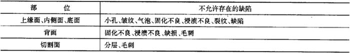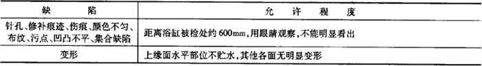 2)缺陷的允许程度。除1)规定之外,在使用面上其他各种缺陷的允许程度如表6-59所示,但背面不受此限制。 表6-59 胶衣型浴缸其他缺陷的允许程度