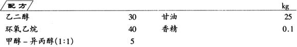 将乙二醇与环氧乙烷在7℃下混合,再加入其余全部组分,充分搅拌均匀,即为成品。用本品涂抹于玻璃表面,寒冷的冬季可防止结霜、防雾。