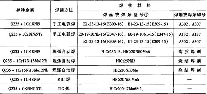 表2-6-22 Q235+奥氏体不锈钢的焊接方法及焊接材料的选择