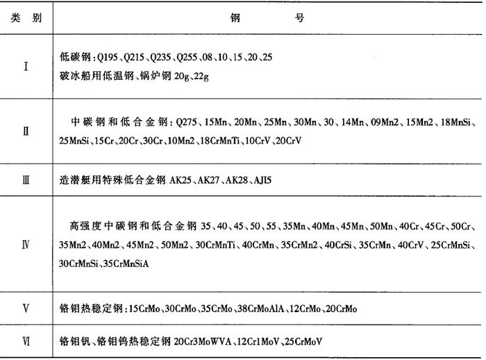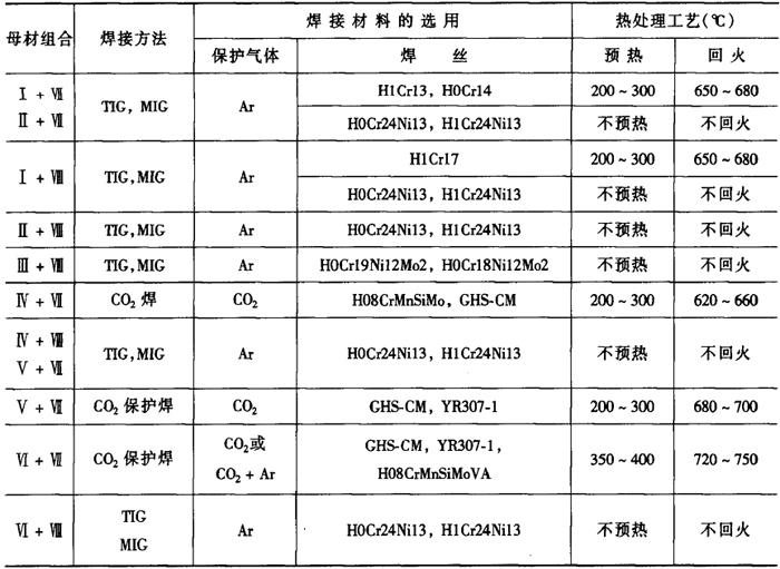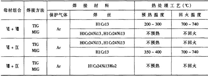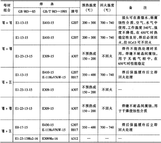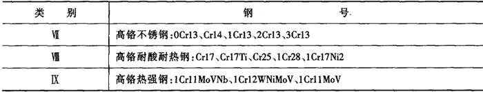 (二)异种高铬钢的焊接 1.高铬钢分类和焊接性 高铬钢的分类见表2-6-13,不锈钢(Ⅶ类)中的1℃r13、2Cr13、3Cr13、4Cr13等及Ⅸ类高铬热强钢也称为马氏体钢,Ⅶ类钢中的0Cr13、Cr14及Ⅷ类钢一般为铁素体+马氏体双相组织,称为铁素体钢或半铁素体钢。 表2-6-13 高铬钢分类[2]