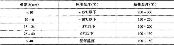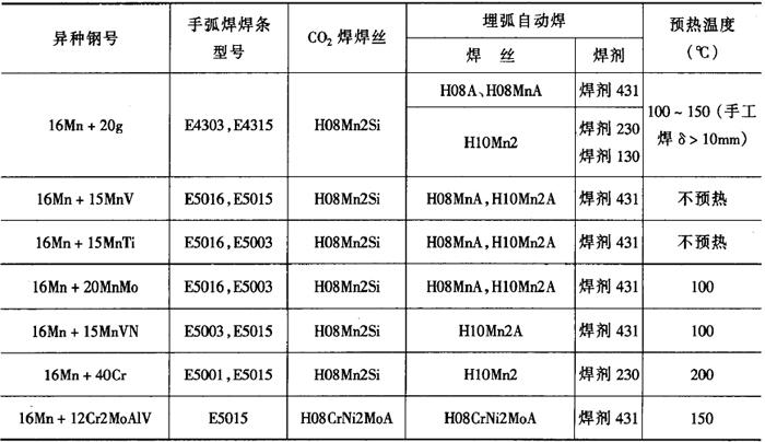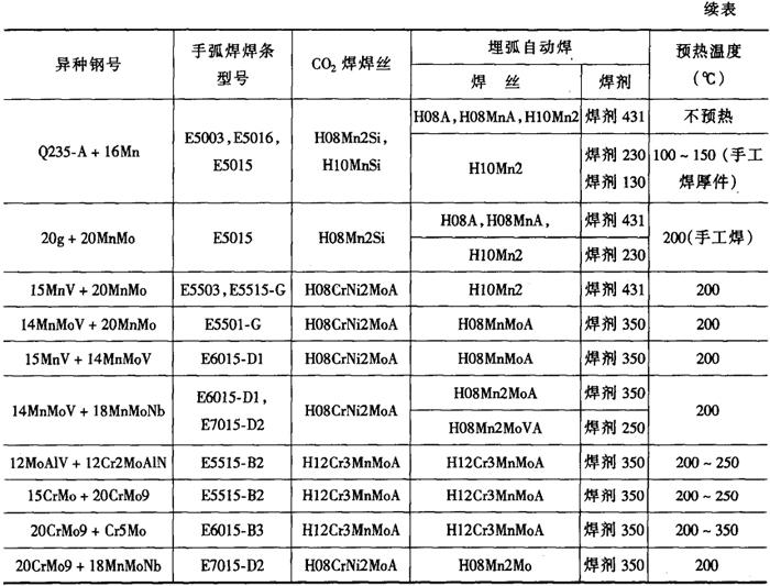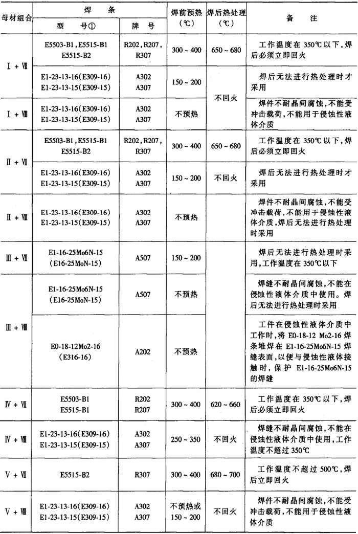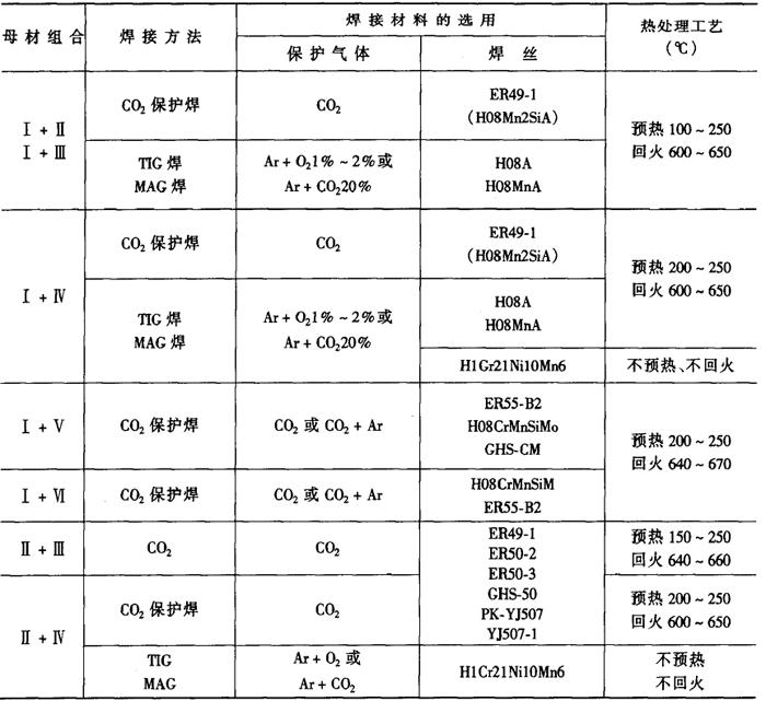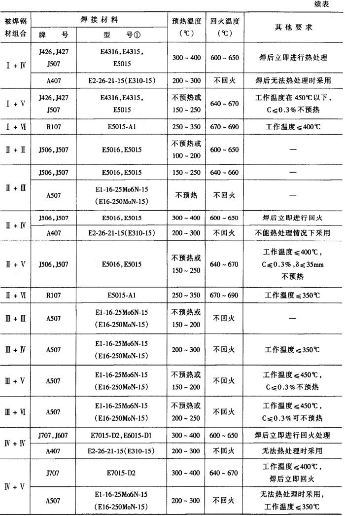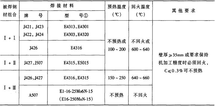 注:焊丝H08Mn2Si;焊丝直径2mm;气体消耗量1100~1300L·h-1①每面第一层。②其余各层。 (3)异种低合金结构钢的焊接(Ⅰ+Ⅱ组合或Ⅱ+IV组合) 在厚板结构和较大拘束度或低温条件施焊时,有产生冷裂纹的可能性。采取一定的工艺措施,可避免产生冷裂纹。 熔化焊方法焊接,焊接材料一般按强度较低的母材选择,焊接工艺应根据强度较高的母材确定。异种低合金钢的焊接材料和预热温度见表2-6-12。 表2-6-12 异种低合金钢的焊接材料和预热温度[3]