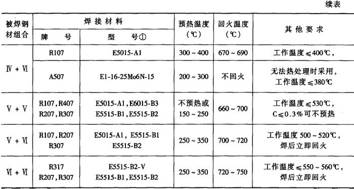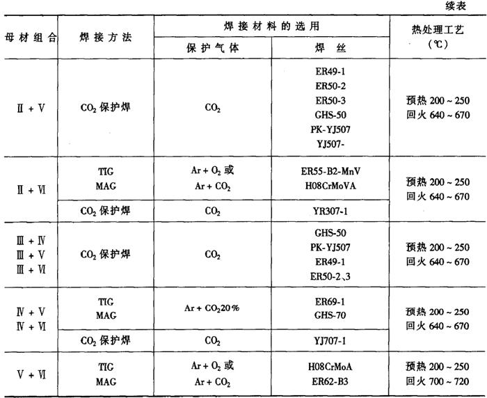 2.异种珠光体钢的焊接工艺 异种珠光体钢焊接时,按强度较低一侧钢材的强度要求选择焊条,其熔敷金属成分与强度较低钢材成分接近,但焊缝的热强性应等于或高于母材金属。某些情况下,为防止焊后热处理或在使用过程中出现碳的迁移,应选用合金成分介于两种母材金属之间的焊接材料。 各种碳钢与低合金钢(Ⅰ~IV类)之间的焊接,选择焊接材料时主要是保证焊接接头的常温力学性能,而对于热稳定钢(V,Ⅵ类)主要是保证焊接接头的高温力学性能。 常温下工作的珠光体淬火钢(Ⅲ,Ⅳ类),如果焊前不预热,最好选用奥氏体焊条焊接,保持焊缝金属的高塑性,避免焊缝及热影响区出现裂纹。 高温下工作的热稳定钢(V,Ⅵ类),则不能用奥氏体焊条焊接,否则可能形成脆性的金属间化合物层和脱碳层或增碳层。如果异种珠光体钢构件焊接接头区在工作温度下可能产生扩散层,最好在坡口上堆焊中间过渡层,过渡层中碳化物形成元素(Cr,V,Nb,Ti等)的含量应高于基体金属。 焊接性很差的淬火钢(第1V类,部分含碳量大于0.3%的V、VI类),焊前应该用塑性好、熔敷金属淬硬倾向低的焊条堆焊一层过渡层(厚度8~10mm),且堆焊后必须立即回火。 焊接异种珠光体钢时,一般选用低氢型焊条,以保证焊接接头的抗裂性能。 常见异种珠光体钢的组合及其焊接材料、预热和热处理工艺见表2-6-3所示。异种珠光体钢气体保护焊的焊接材料见表2-6-4。 表2-6-3 异种珠光体钢的组合及其焊接材料、预热和热处理工艺[2]
