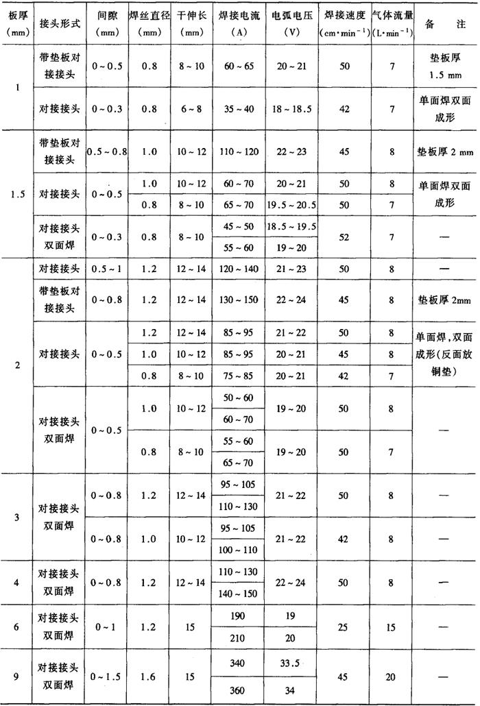 ②CO2气体保护焊 CO2气体保护焊主要用于焊接Q235钢与16Mn钢薄板结构,主要问题是气孔和飞溅。焊接过程中必须加强脱氧,应选择含Si、Mn、Ti、Al元素较多的焊丝,如HO8Mn2SiA。 CO2气体保护焊平焊时的焊接工艺参数见表2-6-7。 表2-6-7 Q235+16Mn钢的CO2气体保护电弧焊平焊焊接工艺参数[3]