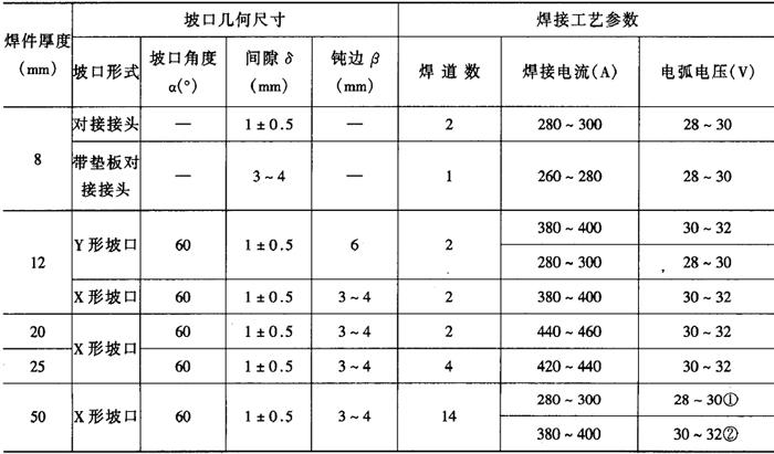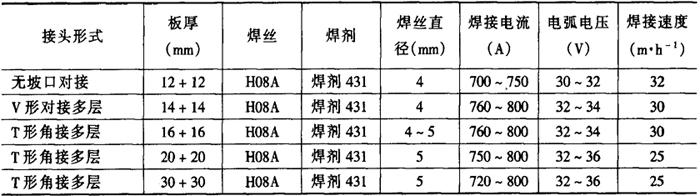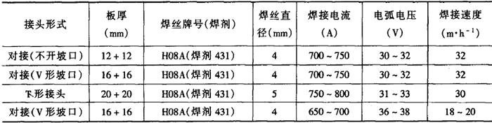 ②埋弧焊 埋弧焊时,按照20g钢的焊接性要求选焊丝和焊剂。按16Mn钢的要求选择预热工艺,一般板厚小于8mm的薄板结构可不预热,板厚在15~30mm时,预热温度为150~250℃,板厚在30mm以上时,预热温度可提高到300~350℃。 20g钢与16Mn钢埋弧焊工艺参数见表2-6-10。 表2-6-10 20g钢与16Mn钢埋弧自动焊的焊接工艺参数[3]