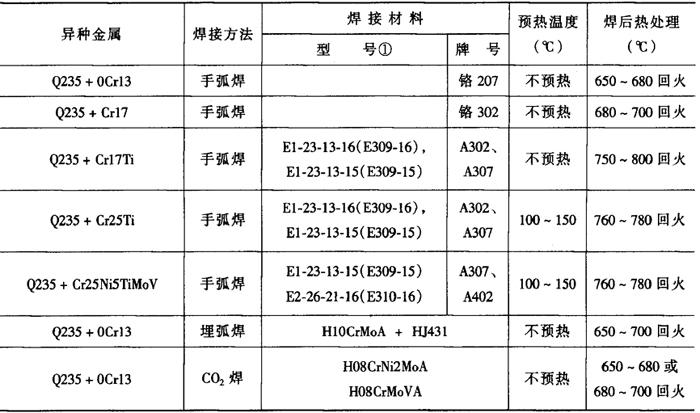 3.焊接工艺 珠光体钢与高铬钢焊接可选用手工电弧焊、埋弧焊、钨极氩弧焊、熔化极气体保护焊、CO2气体保护焊等方法。 珠光体钢与高铬钢(VⅢ类)焊接时,焊前不预热,以防止热影响区粗晶脆化,选用较小线能量焊接,多层焊时,采用窄焊道,层间温度小于100℃;对厚度大的接头,锤击焊缝周围,以减小焊接应力,为了防止裂纹,则需焊前预热,预热温度小于150℃,含铬量高时,预热温度可达200~300℃。焊后需热处理,一般是回火,以降低残余应力,使接头组织均匀化,并提高塑性和耐蚀性。 珠光体钢与马氏体高铬钢焊接时,应焊前预热和焊后热处理,预热温度按淬硬倾向大的钢选取。焊件厚度越大,预热温度越高,一般在150~400℃范围内。多层焊时,层间温度与预热温度相同。焊后热处理可显着降低残余应力,改善接头性能,防止产生冷裂纹。但预热温度过高,异种接头中的马氏体高铬钢侧容易引起晶界碳化物沉淀,形成铁素体,使韧性显着降低,通过高温回火得不到改善,应选用调质处理。 预热温度、回火温度的选择见表2-6-16、表2-6-17。 表2-6-18、表2-6-19分别为Q235和铁素体不锈钢、Q235和马氏体不锈钢的焊接工艺。 表2-6-18 Q235+铁素体不锈钢的焊接工艺[3]