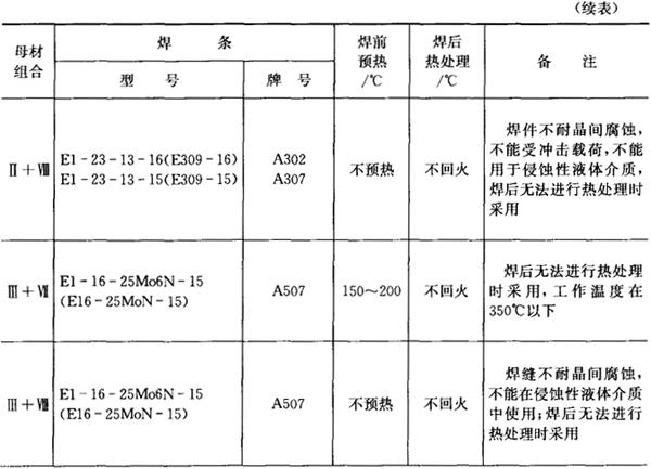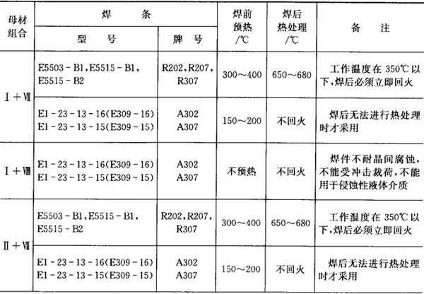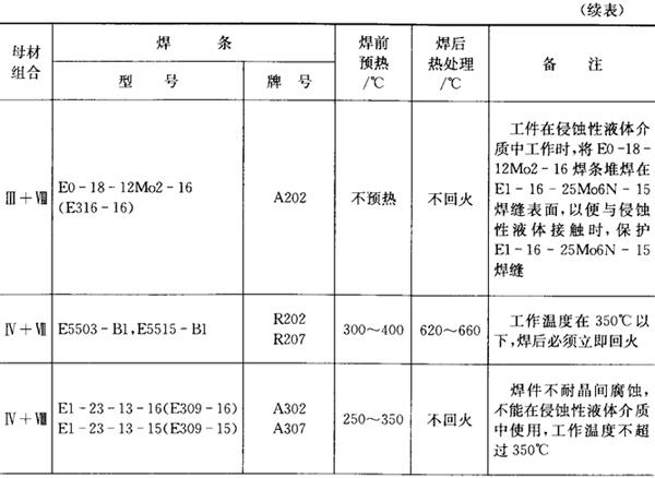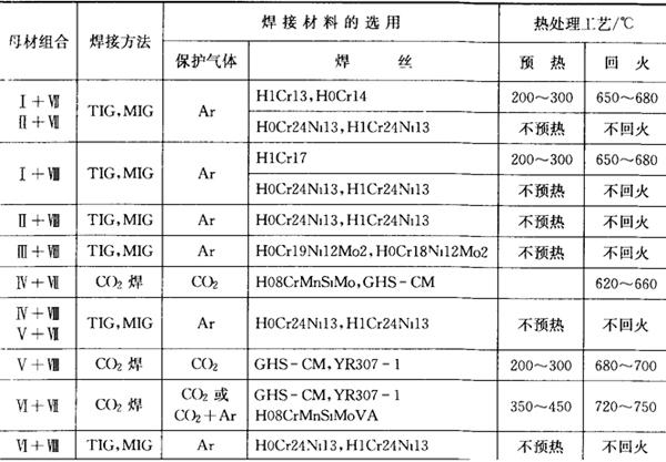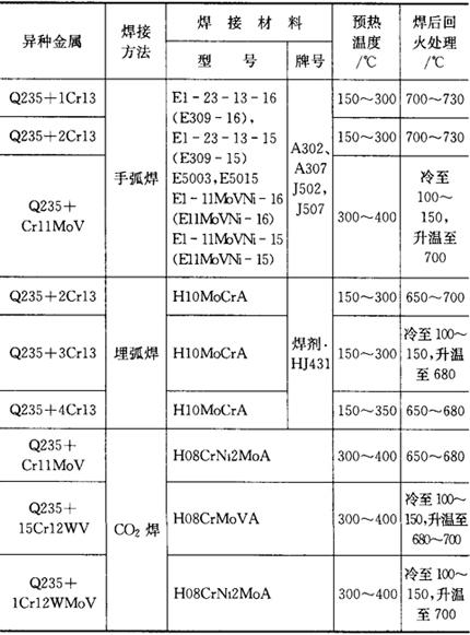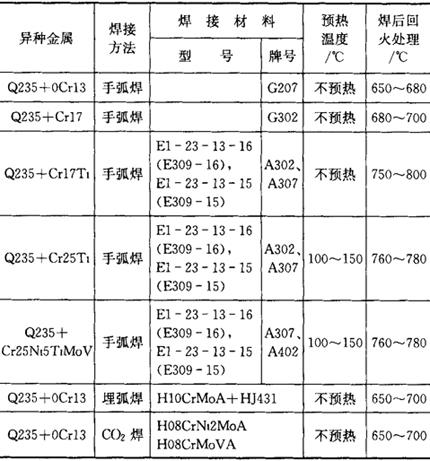 珠光体钢与高铬钢焊接可选用手工电弧焊、埋弧焊、钨极氩弧焊、熔化极气体保护焊、CO2气体保护焊等方法。 焊接时预热温度、回火温度的选择见表7.12-3、表7.12-4。 表7.12-5、表7.12-6分别为Q235和铁素体不锈钢、Q235和马氏体不锈钢的焊接工艺。 表7.12-5 Q235与不锈钢的焊接工艺