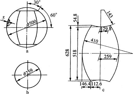 (二)大型球罐构件的计算展开 图6-61为橘瓣式球形贮罐,球壳由对称分带分块拼焊而成,其已知尺寸和计算原理如图6-61b所示。
