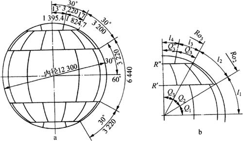 图6-61 1000m3橘瓣式球罐的计算(单位:mm) a.主视图 b.计算原理图 1.赤道带的计算展开 (1)相关参数计算:如图6-61b和图6-62a所示,需计算的相关参数有半纵向中心弧长l1、纵向每等份弧长y、每等份所对球心角Q′1、各等分点所处截圆半径Rn和各等分点横向弧长Sn等,计算如下: