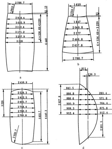 其中 R7=6150×cos30°=5326.1mm,R8=6150×cos35°=5037.8mm,R9=4711.2mm,R10=4348.7mm,R11=3953mm,R12=3527.5mm,R13=3075mm。