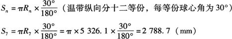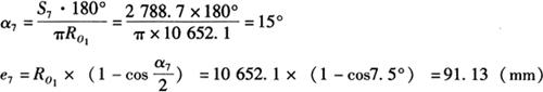 其中 R1=6150mm,R2=6150×cos5°=6126.6mm,R3=6056.6mm,R4=5940.45mm,R5=5779mm,R6=5573.8mm,R7=5326mm。