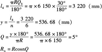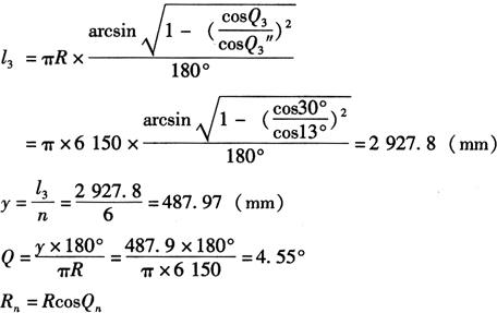 Rn=RcosQ′1 其中 R1=6150mm,R2=6126.6mm,R3=6056.6mm,R4=5940.4mm,R5=5779.1mm,R6=5573.8mm,R7=5320.1mm。