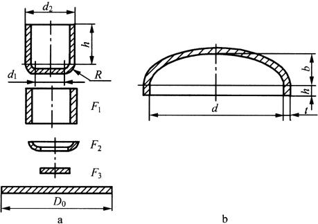 图6-63 旋转体拉深件的计算展开 a.筒形件坯料的尺寸 b.椭圆形封头的尺寸 (1)圆柱面: F1=πd2h (2)转角部: