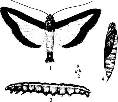 图6-36 瓜绢野螟 1.成虫 2.卵 3.幼虫 4.蛹 【生活习性】 在江西南昌1年发生4~5代。以老熟幼虫在卷叶、缀叶中越冬。翌年4月化蛹,5月成虫羽化,交尾产卵。卵产于叶背面。幼虫缀叶苞,在苞中蚕食叶片,老熟后化蛹苞内。世代不整齐,在7、8、9、三个月,成虫、卵、幼虫、蛹均可同时存在。10月以后吐丝结薄茧越冬。在浙江杭州1年2代。 【防治方法】 冬季清除卷叶、缀叶、枯叶,消灭越冬幼虫。幼虫为害时,喷1~2次敌百虫或杀螟松1000倍液。 长春花上病虫害除上述外,还有锈病、根结线虫病、吹绵蚧、红天蛾等。可参看其他花卉有关部分。 |