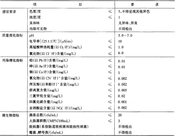 *为蒸馏水加检项目。 微粒子数也是纯水的主要指标,饮用纯水的微粒数一般10个/100mL左右(1μm以上的微粒)。饮用纯水中的无机离子明显低于一般饮用水。 与矿泉水一样,饮用纯水多使用聚酯瓶包装,灌装封盖后不再进行杀菌,因此作为直接饮用水,其微生物指标极为重要。软饮料用水的细菌总数<100个/mL,大肠菌群<3个/L。致病菌不得检出。WHO(世界卫生组织)规定的瓶装饮用水的微生物指标如下:类大肠菌群和大肠菌群均为0个/mL,就是说,瓶装饮用水至少在细菌学质量上不得含有大肠菌群,制造瓶装饮用水的水源应无粪便污染,同时在纯净化处理、贮藏、灌装和以后的加工过程中均应防止微生物的污染,使瓶装饮用纯水的卫生指标符合标准规定的要求。 |