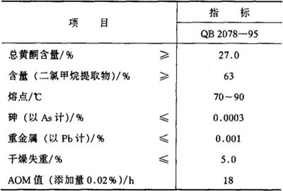 | 释义 | 甘草抗氧化物 别名 甘草抗氧灵、绝氧灵 编码 GB 04.008 化学结构 主要抗氧成分为黄酮类和类黄酮类物质的混合物。 性状 甘草抗氧物是从提取甘草浸膏或甘草酸之后的甘草渣中提取的一组脂溶性混合物。为棕色或棕褐色粉末,略有甘草的特殊气味,不溶于水,可溶于乙酸乙酯,在乙醇中的溶解度为11.7%。 由于甘草抗氧物经薄层分离后所得组分的抗氧化效果都低于总提取物,所以说它是一组复杂而又具相互协同作用的混合物。 制法 将甘草或其他同属植物的根、茎的水提取残留物用乙醇或有机溶剂提取而制得。 质量标准