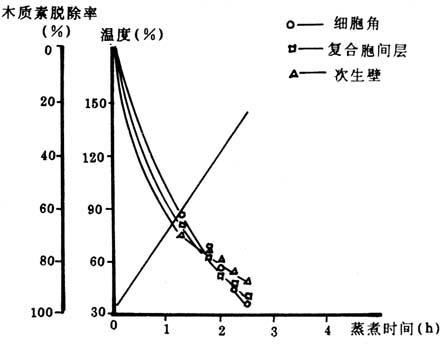 图4-4-2 蔗渣硫酸盐法蒸煮过程中纤维主要部位的脱木质素情况 按Br计数,蔗渣纤维细胞角隅为3041,复合胞间层为2506,次生壁为1537,这就意味着细胞角隅木质素密度为次生壁的1.98倍,而复合胞间层木质素密度为次生壁的1.63倍,当蒸煮温度上升到90℃时,细胞角隅、复合胞间层和次生壁的木质素密度下降幅度分别为62.61%、66.96%和70.85%,即细胞角隅木质素的密度下降幅度为次生壁的0.88倍,而复合胞间层木质素的密度下降幅度为次生壁的0.95倍,这就说明无论哪一个形态区,都含有大量的碱易溶木质素在此低温条件下溶出。当温度上升到110℃时,细胞角隅、复合胞间层和次生壁的木质素密度下降幅度分别为74.61%、78.01%和74.69%,其比例为1∶1.04∶1,彼此没有什么差别;但就90~110℃区间而论,木质素密度下降幅度分别为12%、11.05%和3.84%,其比例分别为3.13∶2.28∶1,却有明显差别,其主要原因,可能由大量酯键裂开而引起的,因酯键的多少,与木质素的密度相关。当温度上升到120℃,细胞角隅、复合胞间层与次生壁的木质素密度的下降幅度分别为82.24%、84.44%和80.29%,其比例1.02∶1.05∶1,这说明彼此有差别,但不明显;但就110~120℃区间而论,木质素密度下降幅度分别为7.63%、6.43%和5.6%,其比例为1.36∶1.15∶1,却有较明显的差别,说明在此温度区间木质素的密度下降幅度细胞角隅>复合胞间层>次生壁,此时纤维开始分散。当温度上升到130℃时,细胞角隅、复合胞间层和次生壁的木质素密度下降幅度分别为90.13%、89.82%和84.97%,其比例为1.06∶1.06∶1,说明有差别,但不明显。就120~130℃区间而论,其木质素密度下降幅度分别为7.89%、5.38%和4.68%,其比例为1.69∶1.15∶1,可见差别明显。说明在此温度区间木质素密度的下降幅度仍然细胞角隅>复合胞间层>次生壁,此时纤维较好分散。当温度上升到140℃时,细胞角隅,复合胞间层和次生壁的木质素密度下降幅度分别为95.57%,95.33%和86.68%,其比例为1.10∶1.10∶1,差别显着;就130~140℃区间而论,木质素密度的下降幅度分别为5.46%、5.51%和1.89%,其比例为2.89∶2.92∶1,说明在此温度区间内,细胞角隅和复合胞间层木质素的下降幅度几乎相当次生壁的3倍,此时纤维完全分散成浆。 蔗渣在KP法蒸煮过程中局部化学研究表明: ①碱易溶木质素是构成蔗渣主要组成,也是分别构成细胞角隅,复合胞间层以及次生壁木质素的主要组成,因而在90℃温度下,脱木质素率可达70%以上,这是蔗渣易于蒸煮的重要原因; ②从90~110℃、110~120℃、120~130℃、130~140℃温度之间细胞角隅、复合胞间层和次生壁木质素下降幅度的比例分别为3.13∶2.88∶1,7.36∶1.15∶1,1.69∶1.15∶1,1.10∶1.10∶1和2.89∶2.92∶1,是导致蔗渣纤维易于解离的主要原因。 |