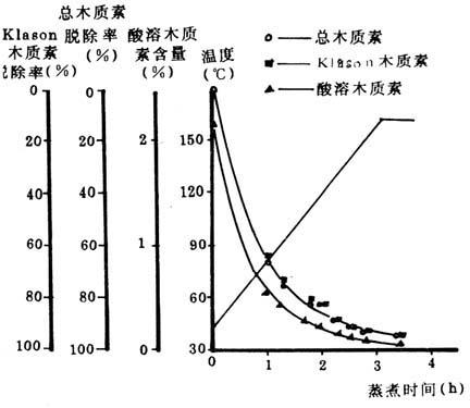 | 释义 | 甘蔗渣硫酸盐法蒸煮脱木质素反应历程 蔗渣硫酸盐法蒸煮过程中,酸溶木质素Klason木质素和总木质素(酸溶木质素与Klason木质素之和)的脱除率以及纸浆得率的变化见表4-4-1和图4-4-1。 表4-4-1 蔗渣硫酸盐蒸煮过程中脱木质素率和蒸煮得率的变化