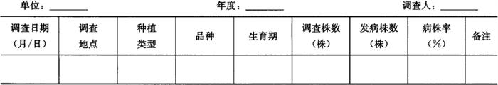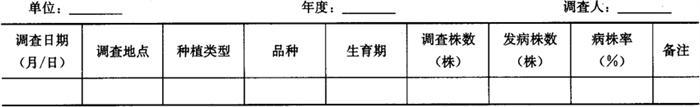 1.2 大田普查 1.2.1 调查时间 分别在甘蔗的幼苗期、分蘖期、伸长期和成熟期各调查1次。 1.2.2 调查田块 按新植蔗、宿根蔗分类型田,每类型选代表性田块调查3块。 1.2.3 调查取样方法 采用平行跳跃取样法,每块蔗田取20个点,每点固定5株,共100株,调查发病株数。将结果记入表7-107。 表7-107 甘蔗黑穗病大田普查记载表