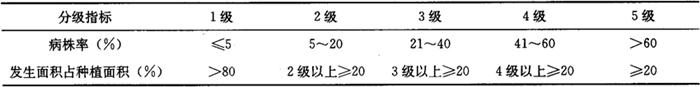 2 预测预报方法 2.1 发生期预测根据系统调查病情消长情况,结合气象因素、历年资料、栽培品种、甘蔗长势和栽培措施等综合分析,预报病害发生期和防治适期。 2.2 发生程度预报 在种植感病品种的蔗区,宿根蔗比新植蔗发病较重,而且宿根年限越长病害发生越重;在迟施偏施氮肥情况下,或宿根蔗在冬、春期间管理不好,会促进迟蘖和侧芽大量生长,利于此病的发生,则发病较重。 3 发生程度分级 发生程度以大田防治前普查的病株发生级别及其面积占总面积的比例为依据;为害程度以大田防治后普查的病株为害级别及其面积占总面积的比例为依据。对照表7-108定级别。