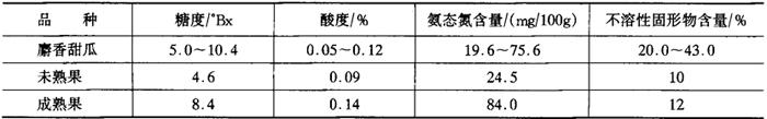 | 释义 | 甜瓜汁 (一)甜瓜的营养成分与加工特性 甜瓜具有独特风味和色调,主要品种有麝香甜瓜(Musk melon)和太子甜瓜(Prins melon)。甜瓜是糖酸比高的水果。甜瓜含糖一般5%左右,我国哈密瓜中心糖度可达10%以上。游离糖有葡萄糖、果糖和蔗糖。此外甜瓜中还含蛋白质0.3%~0.4%、脂肪、β-胡萝卜素以及钾、钙、磷等矿物质。游离的氨基酸有精氨酸、组氨酸、赖氨酸、色氨酸、天冬氨酸、谷氨酸、丙氨酸等16种。有较好的营养价值,麝香甜瓜的营养成分见表2-1-80。 表2-1-80 甜瓜营养成分