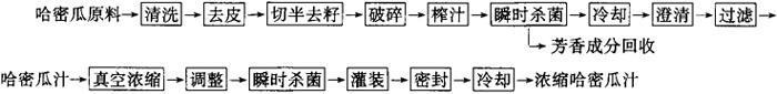 甜瓜在成熟过程中,蔗糖含量增加较快,葡萄糖和果糖及各种游离氨基酸都有增加。但在追熟过程中甜瓜中的蔗糖和酸的含量减少,游离氨基酸中的天冬氨酸、谷氨酸、丝氨酸减少,而丙氨酸、甘氨酸的含量增加,其他不变。 甜瓜单重600~1500g不等,出汁率一般55%~64%。甜瓜果皮占29%~36%,种子3%~3.5%。由于甜瓜pH高,微生物污染后容易败坏,因此制汁前应充分洗净,同时及时进行汁的灭酶和杀菌。另一方面,加热对甜瓜的影响极大,必须引起注意。 (二)甜瓜汁生产技术 甜瓜可以加工成甜瓜汁和浓缩汁。以新疆哈密瓜为原料,哈密瓜和浓缩汁的生产工艺流程如图2-1-55所示。