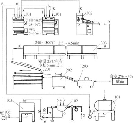 图5-2-1 酥性饼干生产工艺设备流程图 1-食油 2-进汽管 3-水 4-砂糖 5-饴糖 6-糖浆 7-排气管 8-面团 9-饼干生坯 10-饼干 101-贮油罐 102-蒸汽夹层锅 103-贮浆罐 104、105、106-泵 201-饼干冷却线 202-饼干整理机 203-饼干包装机 301-卧式和面机 302-辊印饼干机 303一隧道式烤炉
