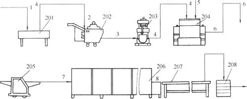 图5-2-2 桃酥生产工艺设备流程图 1-新鲜鸡蛋 2-清洗后的鸡蛋 3-蛋液 4-搅打后的蛋液 5-面粉等主、辅原料 6-桃酥面团 7-桃酥生坯 8-烘制成熟的桃酥 201-洗蛋池 202-去壳机 203-打蛋机 204-和面机 205-桃酥成形机 206-烤炉 207-冷却输送带 208-成品箱
