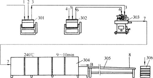 图5-2-4 月饼生产工艺设备流程图 1-面粉 2-香油、饴糖、白糖糖浆 3-面团(皮料) 4-熟面粉 5-香油、白糖、桃仁等 6-馅料 7-月饼生坯 8-烘焙成熟的月饼 301-调粉机 302-调粉机 303-月饼包馅机 304-烤炉 305-冷却输送机 306-成品箱