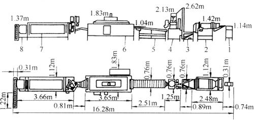 图5-2-7 油炸玉米片的设备布置图 1-料台 2-调湿机 3-提升机 4-挤压机 5-输送带 6-油炸机 7-调味筒 8-最终产品输送装置