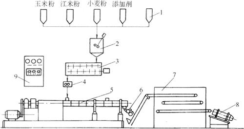 图5-2-8 玉米膨化果生产设备流程简图 1-料筒 2-混合器 3-预处理装置 4-喂料器 5-挤压机 6-切割器 7-烘干箱 8-调味器 9-控制框 |