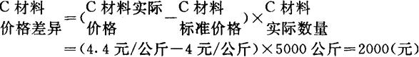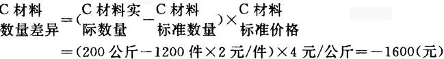 〔例2〕依前便A公司该同直接材料的数量标准为2公斤/件,预计全月生产B产品1000件,实际完成1200件,完耗材料2000公斤,则C材料的数量差异为多少? 解:根据上述公式,将已知条件代入: