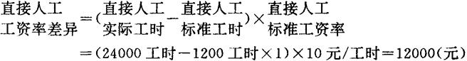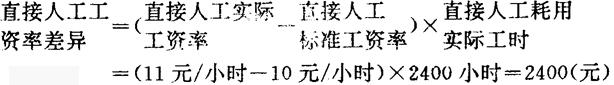 〔例3〕依前例A公司直接人工价格标准为10元/小时,实际价格为11元/小时,该月共用实际工时2400小时,问其直接人工价格差异为多少? 解:根据上述公式,将已知条件代入