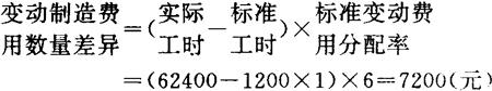 计算结果可A公司该月份变动制造费用价格差异为有利差异8400元,表明该公司能够充分利用工时,节约制造费用。 (二)变动制造费用数量差异 变动制造费用数量差异,亦称“变动费用效率差异”,是指按生产实际耗用工时计算的变动费用与按标准工时计算的变动费用之间的差额,其计算公式为: