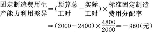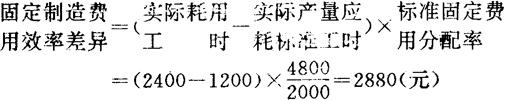 〔例8〕依前例,A公司实际产量应耗用标准工时为2400工时,预计产能标准总工时为2000工时,计算A公司该月份固定制造费用效率差异 解:根据上述公式,将已知条件代入,得:
