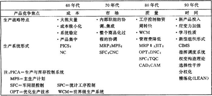 图4.2.1-1 生产战略在企业战略中的地位与作用 (2)生产战略的决策过程 按照生产战略具有构造有效的生产系统这一基本特性,生产战略的核心决策过程可是由两个主要部分组成的。第一,生产系统功能目标决策,包括根据用户的需求特性和企业的竞争战略来定义产品的功能,再由产品将这些功能转换为对生产系统的功能目标;第二,生产系统结构的决策,它是根据既定的系统功能目标和生产系统固有的结构-功能特性,进行生产类型的“匹配”,这种匹配过程是通过调整系统结构与非结构化要素实现的。通过以上两个关键步骤便可实现生产系统对其产品市场竞争优势的保证。 生产战略对生产系统的设计过程与传统的设计过程有两个明显的差异。第一,生产战略强调了对产品竞争实力的保障,通过目标优先级的决策实现了产品竞争优势,而传统方法一般仅以成本和效率为中心,强调系统的高产出与规模经济;第二,生产战略强调了系统各要素间在生产类型结构框架下的协调性,而传统方法由于过份强调高效率与最现代化技术的应用,往往使系统内部的要素组合失调,不能最佳地发挥出那种结构的潜力。总之,生产战略认为生产系统是企业的竞争之本,只有具备了生产系统本身的竞争优势才能赢得产品在市场上的竞争优势,也才会有整个企业成功,因此整个生产战略理论是以竞争及其优势的获取作为基础的。 除了对产品竞争优势的保证功能外,生产战略理论还在进一步发展。人们在探讨生产系统实现了有效性之后生产战略如何帮助系统在运行过程中不断改善效率。实际上,这部分理论已不再是单纯地解决效率问题,由于它是在确保了系统有效性的前提下对运行效率的改善,已在很大程度上消除了生产系统的功能悖论约束,致使系统可以在一个更新、更高的层次上展开竞争,因此生产战略的系统发展理论也被上升到与系统竞争理论相平行的重要地位,两者共同构成了现代生产管理中的战略理论体系。关于生产战略的竞争理论与发展理论将分别在第二、三节中继续深入地进行探讨。 2.产品竞争策略 企业间的竞争,甚至国家间的竞争,主要都是围绕着产品展开的;而产品间的竞争又始终是围绕在能否更好地服务于用户这一中心,竞争的焦点集中于产品基准功能之上的优势功能特性。因此,怎样确定产品的优势功能便成为了产品竞争策略的关键,为此引入一对新概念MQC和OWC,进一步对产品竞争策略的决策过程进行分析。 (1)用户的满意与快乐(Satisfied vs.Delighted) 用户对产品的要求如上节所述可分为六个方面、两个层次,其中第一个基准功能要求层次是达到用户的满意水平,属于符合用户要求的范畴;在此之上的第二个优势功能要求层次则可达到使用户感到高兴、快乐的水平,属于用户意想不到的满足、快慰的范畴。很显然达到第一层次的产品可以进入市场或在其中生存,故亦称这种产品达到了立足市场的标准(Market-Qualifying Criteria,简称MQC)。但在直接竞争对抗(如招标)的过程中,这种MQC产品并不能赢得订货,而且在非对抗的竞争环境中充其量也只能保住(不失去)已有的订货,欲在竞争中求得发展也是极为困难的。要想在激烈竞争的市场环境中得以发展就必须要在第二个层次上比对手产品具有更强的优势特性,即产品达到赢得订货的标准(Order-Winning Criteria,简称OWC),使用户在满意的基础上还感到高兴和快乐。 (2)产品的OWC与PLC 达到用户满意快乐,除了在产品的六项功能指标上具有强度差异特性外,它们还具有很强的变化特性,尤其是产品的OWC特性指标实际上是产品在市场上关键竞争因素的反映,由于市场环境的被干扰和动荡,导致了OWC极为不稳定的易变特性。尽管OWC的变化与很多外界因素有着复杂的作用关系,但通过产品生命周期(PLC)的分析可以建立起产品WC与PLC之间的相关关系,然后根据PLC各阶段的竞争特点可以通过产品需求量及其变化特点的预测得知市场对OWC的综合要求。 (3)产品OWC的决策过程 产品在六项功能指标中的什么方面得到什么样的优先级,便是产品达到赢得订货要求的决策过程,这过程可通过以下四个关键步骤来实现。①需要对产品的MQC指标及其水平进行确定,这可以通过对目前行业水平的了解来判断,如果本行业目前已完全面对国际市场开放则应从国际的平均行业水平来考虑。②对产品进行中、近期的销量预测,目的是判断该产品的生命周期特征。③根据一般的PLC各阶段竞争特性理论,结合产品中、近期的所处状态,分析产品的赢得订货标准。④根据企业自身所特有的竞争指导思想,最后对产品的OWC进行决策。 (4)产品的通用竞争战略与OWC 人们熟知的产品竞争战略有成本领先、别具一格、和集中一点三种典型模式,其本质就是要形成产品的特异性,经验证明任何试图减少这种特异性的中庸策略都是不可能有大作为的。在产品MQC基础上突出OWC的作用实际上就是进一步将产品的竞争战略细化到其功能特性指标之上,所以它是对通用战略的具体落实。但另一方面也应注意到通用战略的决策过程与OWC的决策过程是不同的,OWC的决策在第四步要受到通用战略的影响,而通用战略的模式选择则要紧密结合企业内部的资源优势特点来进行。 3.生产系统的功能目标决策 生产系统的功能目标保证着系统的有效性,它是与产品所应具备的功能特性完全一致的。因此生产系统的功能目