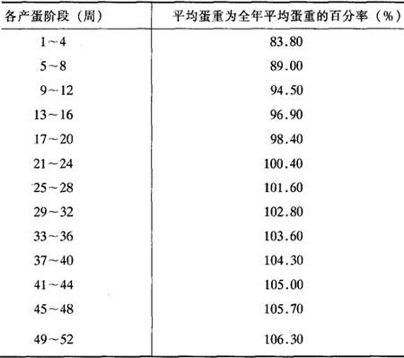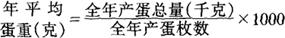 (2)开产蛋重 全群产蛋率达50%为开产日龄,开产日龄那天全群产蛋的平均重量即为开产蛋重。开产蛋重过小,表明性成熟控制不佳,母鸡过早开产,以后产蛋持续性差,蛋重也小。 (3)平均蛋重 母鸡在300日龄(42~43周龄)所产蛋的重量与年平均蛋重相近,一般常以300日龄蛋重代表全年平均蛋重。准确计算公式为: