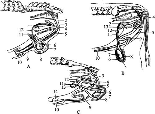 图1-18 公畜生殖器官比较模式图 A.马 B.牛 C.猪 1.直肠 2.精囊 3.前列腺 4.尿道球腺 5.阴茎缩肌 6.附睾 7.睾丸 8.阴囊 9.阴茎 10.包皮 11.精索 12.输精管 13.膀胱 14.包皮憩室 睾丸在胚胎时期位于腹腔内肾脏的前下方,出生后移入阴囊,是产生精子和雄性激素的地方。雄性激素可促进副性腺发育,维持和增强性欲及第二性征。 附睾后连输精管,是贮存精子和促进精子成熟的地方。 输精管是输送精子的管道。精索由血管、神经、淋巴管、睾内提肌、输精管及结缔组织包裹固有鞘膜所构成。 阴囊为一皮肤囊,自外向内依次为皮肤、肉膜、睾外提肌、总鞘膜构成,内含睾丸、附睾和部分精索(图1-19)。