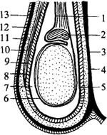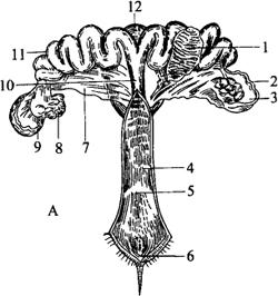 图1-19 阴囊结构模式图 1.精索 2.附睾 3.阴囊中隔 4.总鞘膜纤维层 5.总鞘膜 6.固有鞘膜 7.鞘膜腔 8.总鞘膜 9.总鞘膜纤维层 10.睾外提肌 11.筋膜 12.肉膜 13.皮肤 尿生殖道是输送尿液和精液的共同通道。它起于膀胱颈止于龟头,以坐骨弓为界分为骨盆部和阴茎部,末端开口称尿道外口。 阴茎是交配器官,由阴茎海绵体和尿道海绵体构成。交配时海绵体充血使阴茎勃起而突出于包皮,平时阴茎在退缩肌的作用下而藏于皮肤褶形成的包皮内。 (2)母畜生殖系统 由卵巢、输卵管、子宫、阴道、尿生殖道和阴门等器官组成(图1-20)。