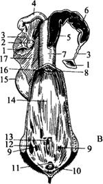 图1-20 母畜生殖器官 A 母猪的生殖器官(背侧面) 1.子宫黏膜 2.输卵管 3.卵巢囊 4.阴道黏膜 5.尿道外口 6.阴蒂 7.子宫阔韧带 8.卵巢 9.输卵管腹腔口 10.子宫体 11.子宫角 12.膀胱 B 母牛的生殖器官(背侧面) 1.输卵管伞 2.卵巢 3.输卵管 4.子宫角 5.剖开的子宫角 6.子宫阜 7.子宫体 8.阴道穹窿 9.前庭大腺开口 10.阴蒂 11.前庭小腺开口 12.剥开的前庭大腺 13.尿道外口 14.阴道 15.膀胱 16.子宫颈外口 17.子宫阔韧带 卵巢是产生卵细胞和雌性激素的地方。它的形状和大小因家畜种类不同而不同。牛的卵巢为扁椭圆形。未产母牛的卵巢大多位于骨盆腔内耻骨前缘两侧稍后方。经产母牛的卵巢则前移至耻骨前缘的前下方。猪的卵巢在性成熟前呈豆形,表面平滑,为淡红色,位于骨盆腔前口两侧上部;接近性成熟时呈桑椹状,约位于髋结节前端的横断面上;性成熟后呈一串小葡萄状,位置进一步前移至髋结节前约4厘米的横断面和腹侧壁中段水平面交点处。 输卵管是输送卵子的管道和完成受精过程和胚胎卵裂的地方,由前向后依次分为漏斗部、输卵管伞、壶腹和峡部。 子宫是胎儿发育的地方,分子宫角、子宫体和子宫颈三部分。 阴道是交配器官和产道,以阴瓣和尿道外口后接尿生殖前庭。牛尿道外口的下方有一尿道憩室(图1-21)。给牛导尿时应注意不能将导尿管插入憩室内。