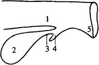 图1-21 母牛尿道憩室位置示意图 1.阴道 2.膀胱 3.尿道 4.尿道憩室 5.尿生殖前庭 |