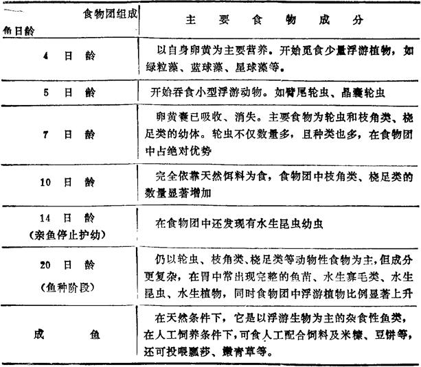 二、食性 尼罗非鲫在生长过程中,从动物食性向植物食性转换,见表35—2。它能消化吸收很多鱼类不能消化的藻类,如微囊藻、项圈藻等,见表35—3。即从这些藻类中摄取的碳,平均43%可以吸收,从小球藻摄取的碳最高约吸收50%,因此在养殖尼罗非鲫时,施肥培饵法和投饲法并用,效果更好。 表35—2 尼罗非鲫食性