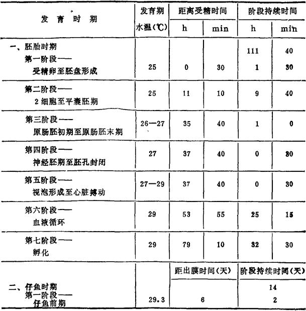 1.生殖习性 在非生殖期间,非鲫一般喜群游。当水温达到20℃以上,雄鱼离群在池边占地挖窝。挖窝时,雄鱼先用尾鳍摆动,大口将泥沙含入口中,随后向四周喷出,此过程直至把窝挖好。窝的大小、多少与亲鱼数量和个体大小有关。一般窝间距为0.5—1m,窝的直径0.3—0.4m,窝深0.1—0.2m。鱼窝上大下小呈盆状。 雄鱼挖窝完成后,引诱雌鱼进窝,并随时驱赶靠近的其他鱼。雄鱼不断地在雌鱼周围打转,时而顶雌鱼的腹部,时而尾随雌鱼。此时雄鱼的体色更为鲜艳。雌鱼的生殖孔更加突出,不久开始产卵。产卵时间持续15—30min,分4—6次产完。第2—4次产卵最多。雌鱼每次产卵后,转身将卵含入口中,在雌鱼含卵的同时,紧接雄鱼排精于卵上,精子随着雌鱼含卵的过程进入口腔使卵受精。 2.孵化与哺育 尼罗非鲫孵化和鱼苗的哺育在雌鱼口腔中进行。水温25—29℃时,卵从受精到孵化出膜需要80—111h。鱼苗在雌鱼口腔中哺育时,雌鱼喉部增大,离窝独游。刚从口腔中出来的鱼苗,游泳能力很弱,经常密集在雌鱼的周围,边游动边吃食。当遇到敌害或听到较大的响声时,雌鱼立即游向鱼苗处,同时小鱼苗也迅速群集在亲鱼的周围,很快被雌亲鱼含入口腔中,来不及进入口腔的少数鱼苗,则从亲鱼的腹部游至下颌,再从下嘴唇移向口边,一尾尾被含入口腔内。待亲鱼确认周围安全时,再将鱼苗从口腔中吐出。上述情况要持续几天,直到鱼苗体长约1.5cm能够独立生活为止。 尼罗非鲫,仔鱼、稚鱼发育时程见表35—5。 表35—5 尼罗非鲫胚胎、仔鱼、稚鱼发育时程