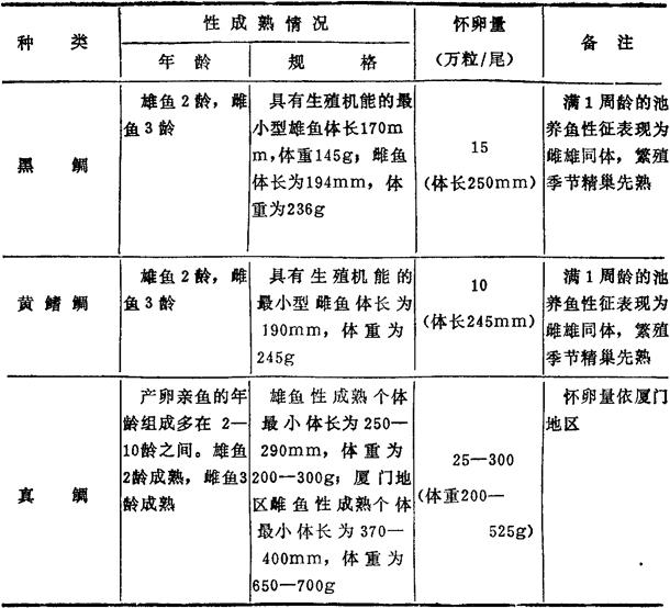 | 释义 | 生物学特性 1.分布及栖息环境 黑鲷广泛分布于我国沿海,多栖息于水深5—50m的沿岸带,尤喜栖息于港湾及河口的多礁浅水区。黄鳍鲷产于我国东海和南海,尤以广东、福建及台湾沿海居多,为浅海底层鱼类,喜栖息在岩礁海区。真鲷分布于我国沿海,喜栖息在岩礁、砂砾、贝藻类丛生的海区,特别喜欢在海底凹洼处停留,栖息水层一般在20—90m。 2.食性及食饵组成 黑鲷为杂食性,喜食贝类、多毛类,其次为小型的杂鱼虾及海藻。在人工养殖条件下,大量摄食贻贝、蓝蛤、寻氏肌蛤、小型鰕虎鱼类,同时也能吞食个体较小的或正在蜕皮的对虾以及部分商品饵料如豆饼、糠虾干等。除此之外,也啄食池壁上的藻类。 黄鳍鲷:杂食性,以小型甲壳类、贝类、沙蚕及藻类、有机碎屑等为食。在人工养殖条件下,杂鱼虾、花生饼、米糠等都是良好的饲料。 真鲷:杂食性,性贪食,喜食多毛类,其次是虾、蟹、贝及鱼类。人工养殖中可采用新鲜或冰冻低值鱼、贻贝、扇贝加工下脚及部分商品饵料。 以上三种鲷鱼稚鱼阶段的摄食对象以浮游甲壳类为主,幼鱼阶段开始摄食底栖动物。 在人工养殖的情况下,黑鲷、黄鳍鲷一般不结群游泳,而是各自在底层或近底层处觅食;真鲷喜集群,游泳迅速,常绕池或网箱觅食。 3.繁殖 鲷类产卵期因种类和地区的不同而有所差异。黑鲷在山东沿海,产卵期为5月份;福建沿海,在3月中旬至5月初,盛期在3月下旬至4月上旬。产卵适温为15—23℃。黄鳍鲷在福建、广东等省沿海,产卵期为10月下旬至12月上旬,产卵适温16—24℃。真鲷在厦门地区的繁殖期在10月下旬至12月下旬;黄渤海区的产卵期在5月至7月份,盛期在5月下旬,产卵适温16—23℃。 鲷类的性腺属多次成熟、分批产卵类型。其怀卵量随年龄与体重而变化,性成熟年龄及个体规格因种类及地区不同而异(表36—1)。 表36—1 鲷类生殖概况表