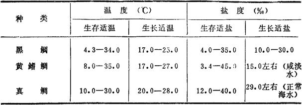5.对温度、盐度的适应 不同种类的鲷鱼对温度、盐度的适应能力不同(表36—2)。 表36—2 鲷类对温、盐度的适应