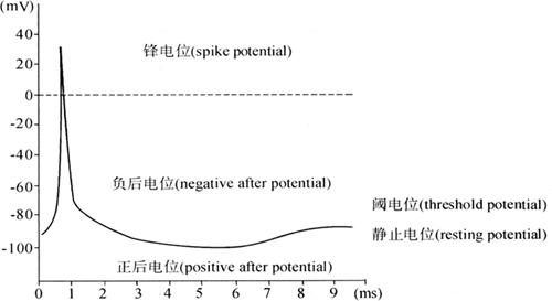 图4-5 神经纤维静息电位示意图 (二)动作电位 动作电位(action potential)是指可兴奋的细胞受刺激发生兴奋时,细胞内发生一次可传播的电位变化。它是细胞兴奋的标志。 动作电位是一个连续的电位变化过程(图4-6)。当细胞接受刺激后,细胞膜内立即发生一次快速的去极化。开始是膜内电位由静息电位上升至阈电位(threshold potential),然后膜内电位快速上升到零进而转变为正电位,形成动作电位的上升支(通常膜电位由-90mV上升至+30mV),电位变化的幅度为120mV。这一去极化过程也称为除极相(depolarization phase)。该相从0mV到+30mV的一段反极化状态称为超射(overshoot)。当动作电位上升支达到顶点后,膜内电位立即快速回降,由正变负,恢复到静息电位水平,形成动作电位的下降支。然后,膜电位还有一个缓慢的波动才完全恢复到原来的静息电位附近。这一过程称为复极相(repolarization phase)。动作电位的上升支与下降支形成一个尖锋,称为锋电位(spike potential)。在锋电位之后,动作电位复极相还包括负后电位(negative after potential)和正后电位(positive after potential)。