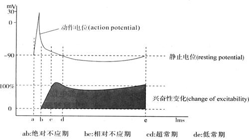 图4-6 动作电位曲线 不同细胞的动作电位持续时间是不同的。神经纤维的动作电位一般持续0.5~2.0ms,而心肌细胞可达300ms。神经纤维上的锋电位持续时间很短,一般不超过2.0ms。通常神经纤维在接受刺激产生动作电位后,其兴奋性可发生周期性改变。在神经纤维接受刺激产生锋电位期间,对任何强大的刺激都不发生反应,因此称此期为绝对不应期(absolute refractory period)。在负后电位离阈电位较近的一段时间内,只有给以较强的刺激才能产生新的动作电位,故称此期为相对不应期(relative refractory period)。在负后电位离静息电位较近的一段时间只需阈下的刺激就可以引起反应,因此将这个时期称为超常期(supranormal period)。在正后电位这段时间里,膜电位处于超极化状态,需要更强的刺激才能引起反应,因此称此期为低常期(subnormal period)(图4-7)。以上兴奋性的周期性变化,与膜离子通道的开、关以及备用等不同状态有密切关系。