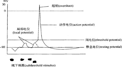 图4-7 产生动作电位的过程中细胞兴奋性的变化 动作电位的产生是在细胞接受阈刺激或阈上刺激时,膜上的Na+通道开放,Na+内流,使膜发生去极化达到阈电位水平,引起膜上Na+通道大量开放,Na+快速大量内流,膜内电位迅速上升,形成动作电位的上升支。这里所谓阈电位,是指引起膜上Na+通道大量开放的临界膜电位。当Na+通道大量开放,Na+快速内流的力与膜内正电荷的排斥Na+继续内流的力相等,即达到Na+的平衡电位时,除极相达到顶点。Na+通道开放的时间非常短暂,通常开放0.5~2.0ms后钠通道立即关闭失活,在如此短暂的时间内膜内的电位可改变120mV。故将Na+通道称为快Na+通道(fast Na+ channel)。钠离子通道失活后,一直要等到膜复极化到一定水平才开始复活,直到处于备用状态。在钠通道失活的同时,膜上的K+通道(potassium channel)再次开放,K+顺浓度差向膜外扩散使膜内电位由正值向负值转化,直至恢复到静息电位水平,构成动作电位的复极相(repolarization phase)。每次动作电位之后,虽然进入细胞内Na+和外出的K+量都很微小,但必须依靠细胞膜上的钠泵(sodium pump),将内流的Na+和外流的K+逆着浓度差转运回细胞外和细胞内(图4-3)。 动作电位的产生具有以下特点:①“全或无”(all-or-none)。即动作电位的大小不随刺激的强度增加而加大。②不衰减性传导。即动作电位的幅度不因传导的距离的加大而减小。在神经纤维上传导的动作电位称为神经冲动(nerve impulse)。神经冲动之多少,是衡量神经紧张度的一个标准。单位时间内传导的冲动次数多,表示神经紧张度高;反之,则低。但每两个动作电位之间总有一定的间隔,这是由于每产生一次动作电位的过程中,存在着绝对不应期的缘故。 了解生物电的形成原理具有重要的临床意义。临床上在使用电解质制剂时,应考虑它们对生物电的影响。如给患者输入KCl,会使细胞外K+浓度改变,从而改变细胞内外的K+浓度梯度,可能影响与K+有关的RP和AP的复极相。此外,用一些药物可选择性阻断膜上某些离子通道。例如河豚毒(tetrodotoxin,TTX)可选择性阻断钠通道,但对钾通道没有影响,从而仅影响AP上升支,但对静息电位没有影响;四乙基胺(tetraethylammonium,TEA)则是钾通道的特异阻断剂。 (三)局部电位 阈下刺激(subthreshold stimulus)不能使膜去极化达到阈电位(threshold potential),因此不能引发动作电位。但阈下刺激可以引起膜上少量的Na+通道开放,少量Na+内流,引起部分去极化,产生局部电位(local potential),也称局部反应(local response)(图4-8)。局部电位的特点是:①局部电位的数值小,呈递减性传播;②随阈下刺激强度的增强而加大;③多个阈下刺激引起的局部电位可叠加起来,就有可能使膜的去极化达到阈电位,从而引发动作电位。这对中枢神经元(neuron)的受体在时间上或空间上接受多个信号的刺激而激发神经元的兴奋具有重要意义。