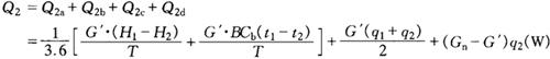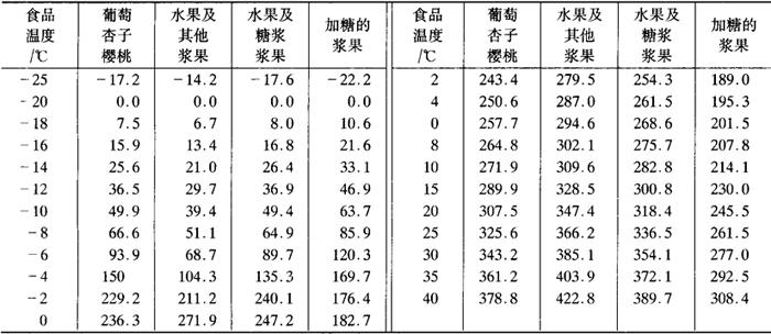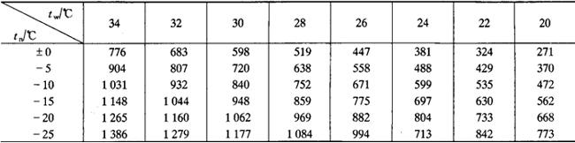 式中 Q2a——食品热量,W Q2b——包装材料和运载工具热量,W Q2。——食品冷却时的呼吸热,W Q2d——食品冷藏时呼吸热,W G′——冷间每日进货量,kg H1——食品进入冷间初始温度时的热焓值,kJ/kg,见表6-7-59 表6-7-59 食品的热焓值表 单位:kJ/kg